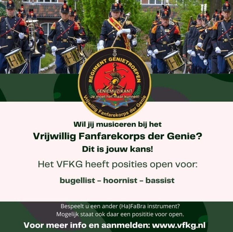 Momenteel staan er een aantal (extra) posities open bij het VFKG. Ben jij een goede fanfare(HaFaBra)blaasmuzikant, orkestslagwerker of tamboer en wil je spelen bij het mooiste en het grootste vrijwillige muziekkorps met een geweldige militaire uitstraling vol met Genie tradities, Meld je aan. Sodeju! Je ontvangt dan alle gewenste informatie. Hopelijk tot ziens op de Van Brederodekazerne te Vught voor een eerste kennismaking. Aanmelden kan op deze website onder "Contact/ formulier" in te vullen!