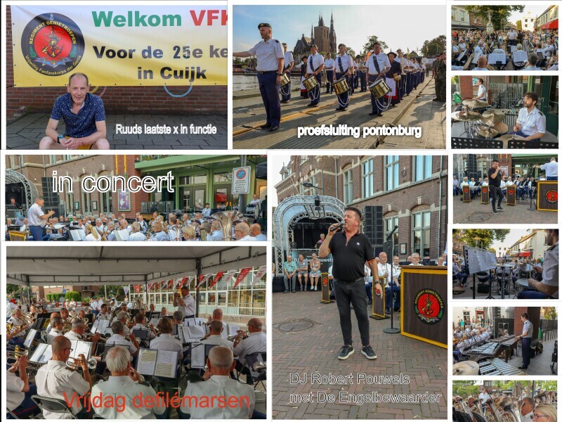 En met DJ Robert Pouwels sluiten we af met o.a. De Engelbewaarder die door het enthousiaste publiek om herhaling vraagt! We eindigen met de 105 waterbouw compagnie met het Mineurslied. De volgende dag begeleiden we de wandelaars voor het gemeentehuis van Cuijk. En melden ons af bij de Commandant Regiment Genietroepen op de pontonburg.